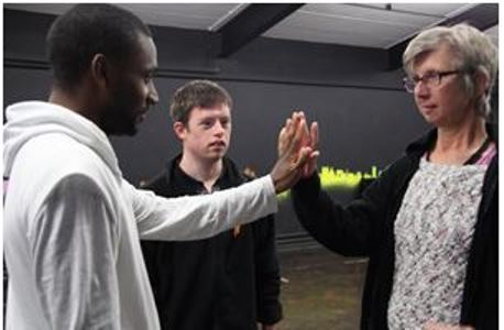 The "AMANDLA!" of disabled actors and dancers, both white and black, are supported by five members of staff and volunteers and the artistic director who is "treading the boards". Cerebral palsy, autism, spina bifida, blindness, partial sight, epilepsy and learning difficulty are all present on stage too. The acting company membersare seated on two sides of the stage throughout the two acts and integrate with the action at all times via vocal, percussive and signing gestures. African drumming and song play a part.