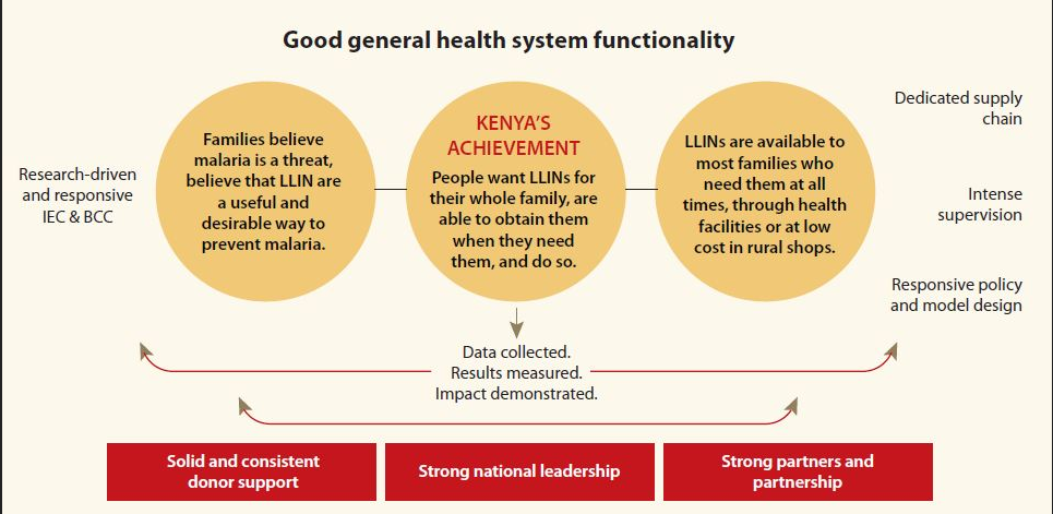 In addition, strong leadership ensures coherent co-ordination of a solid partnership with consistent donor support. According the brief, the strength and vision of the DoMC underpins the success of their continuous distribution model. The DoMC works with a solid and focused partnership of two key donors, the Department for International Development (DfID) and the United States Agency for International Development (USAID), and a dedicated implementing partner (PSI/Kenya) that works closely with the private sector and some grass-roots community-based organisations. The partnership is broad in that it crosses sector boundaries, but it is crucially centred on a few strong, dedicated, and responsive partners. Lastly the brief credits a relatively supportive and well functioning health system environment for the success of the distribution systems.