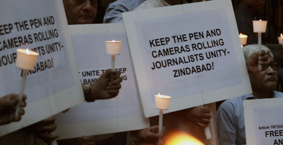 Thomson Reuters Foundation website on June 15 2023. Image caption/credit: Journalists hold candles and placards during a candlelight vigil against police brutalities and attacks on press freedom in Mumbai, India, December 26 2019. REUTERS/Francis Mascarenhas